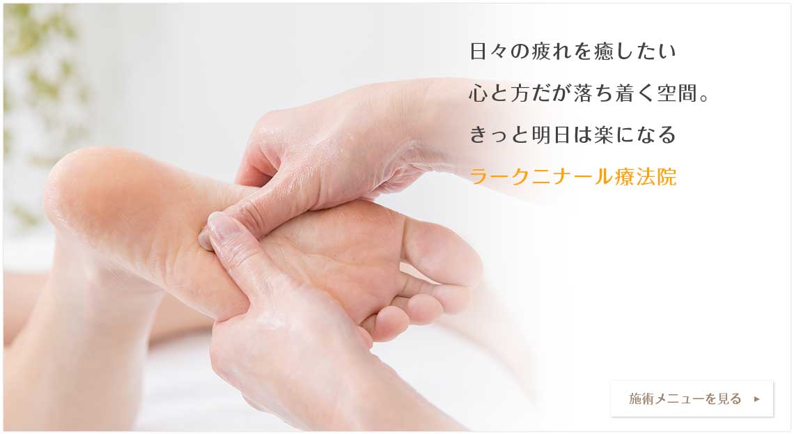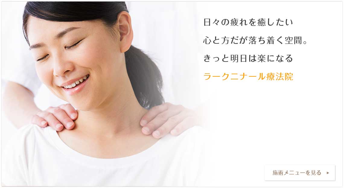肩が凝る、腰が痛い、足がむくんでダルいと感じたら、癒しの空間、ラークニナールで楽になりませんか?心より皆様のお越しをお待ちしております。